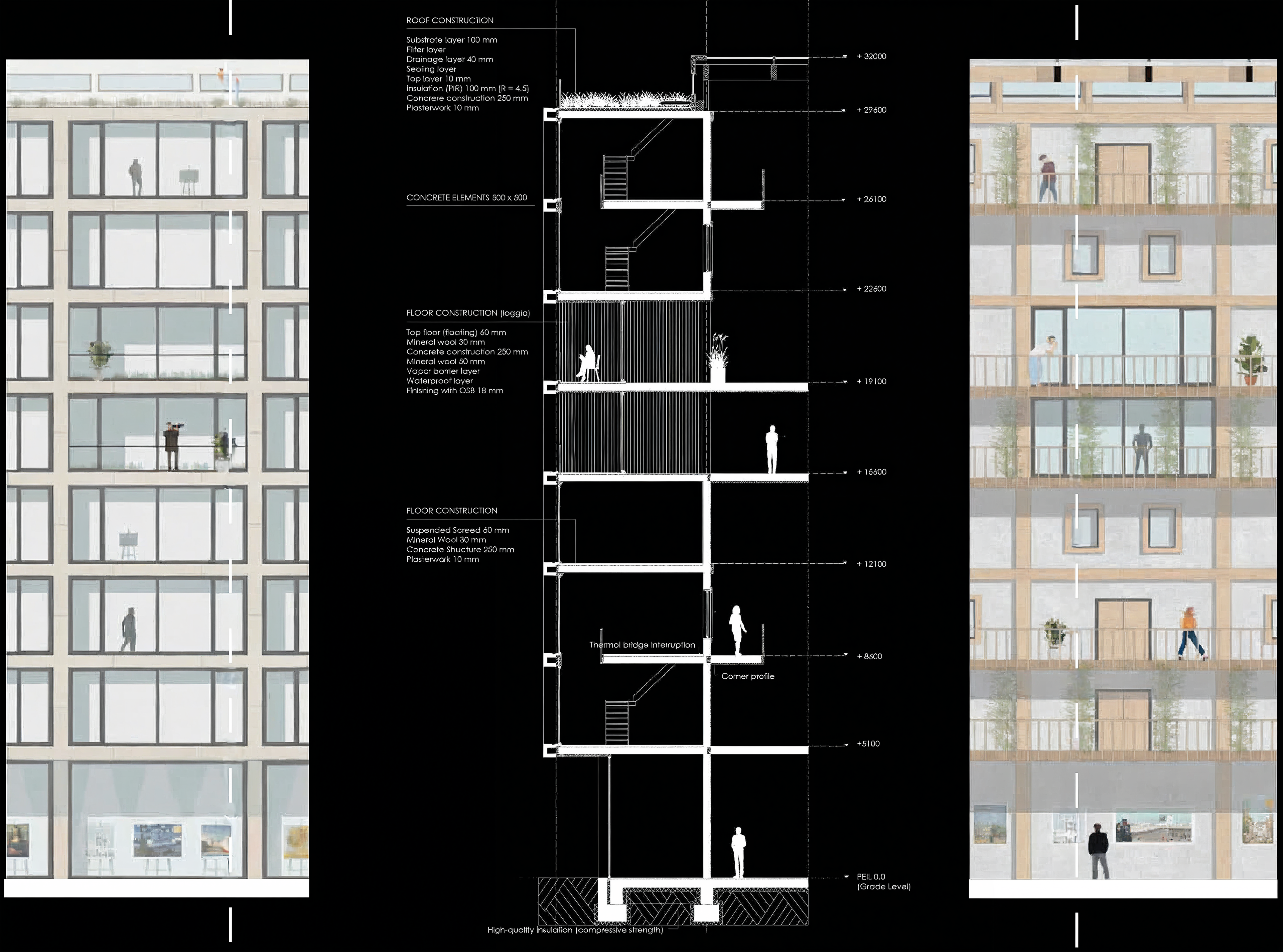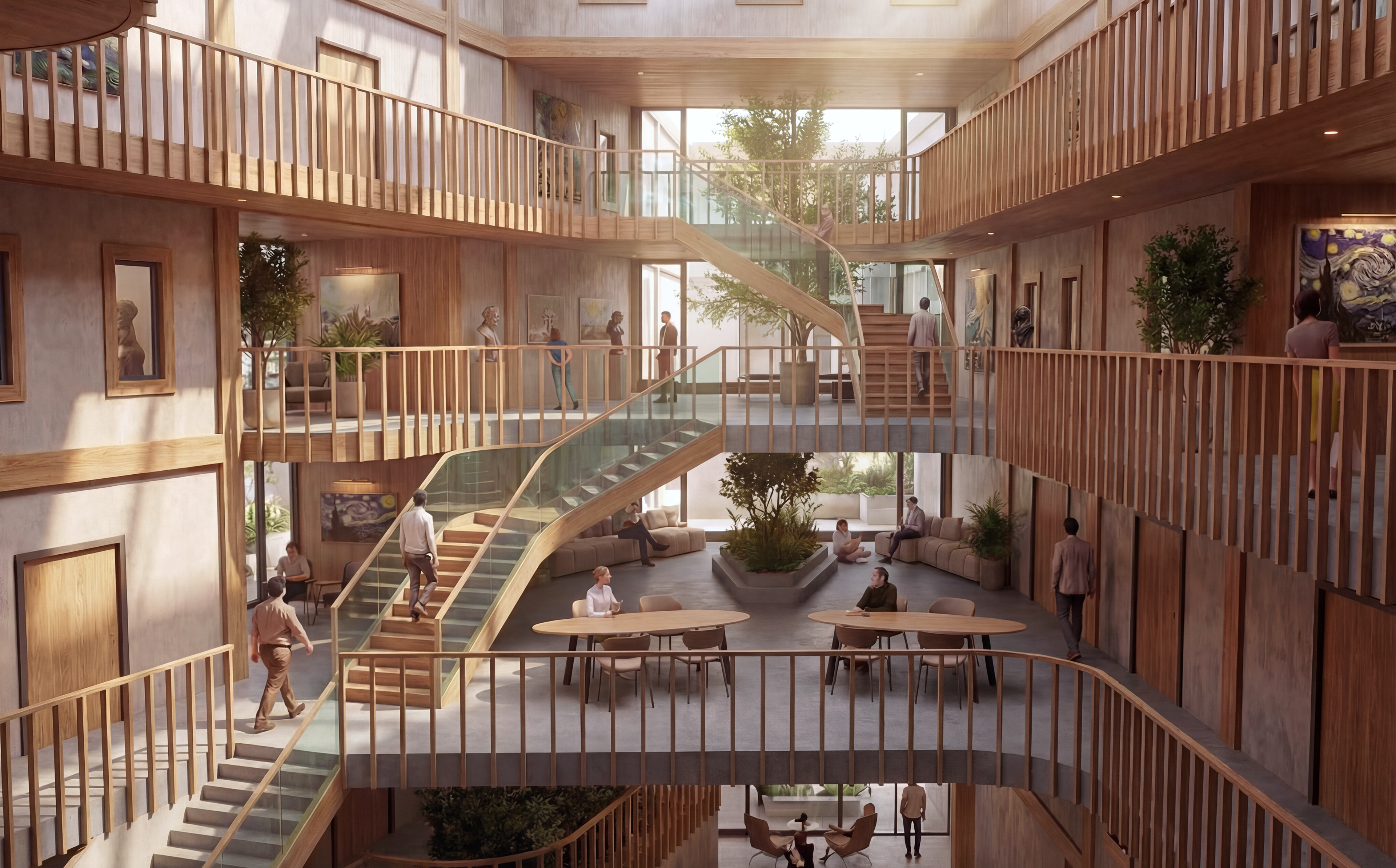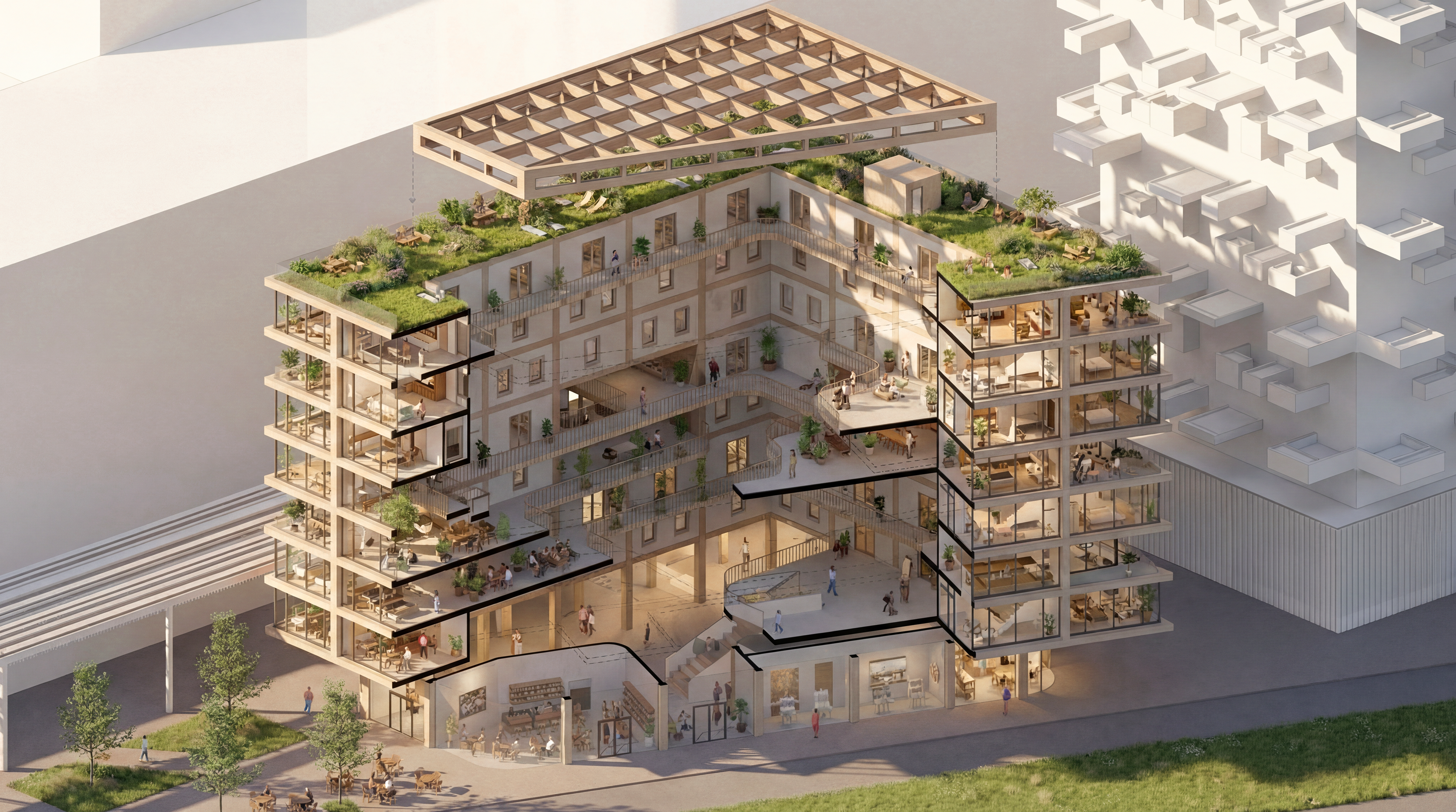 In addition to the residences, the building also features an atrium. This atrium extends from the ground floor to the roof and encompasses an organic interior with platforms that contrast with the orthogonal exterior. At some points, this interior penetrates the outer shell of the building, promoting both natural light entry into the atrium and creating interesting spaces. The themes of interaction and art take center stage here. The platforms are equipped with co-working spaces, exhibition areas, relaxing loggias and meeting spots. It becomes the perfect place for artists to exchange ideas, find inspiration, showcase their work, and retreat to their own residences when desired.