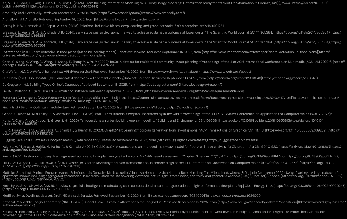 The application of generative AI and machine learning in architecture has expanded significantly in recent years, particularly in the domain of automated floorplan generation. Models based on generative adversarial networks, diffusion methods, and graph representations have been developed to produce architectural layouts that satisfy functional and spatial constraints (Nauata et al., 2021; Shabani et al., 2023; Hu et al., 2020). For example, Graph2Plan, trained on the RPLAN dataset of approximately 80,000 annotated floorplans, demonstrates how neural networks can translate abstract spatial graphs into coherent architectural layouts. These approaches illustrate the potential of AI to accelerate early-stage design exploration, but they often remain disconnected from performance considerations such as daylight, thermal comfort, and energy demand (Weber et al., 2022).