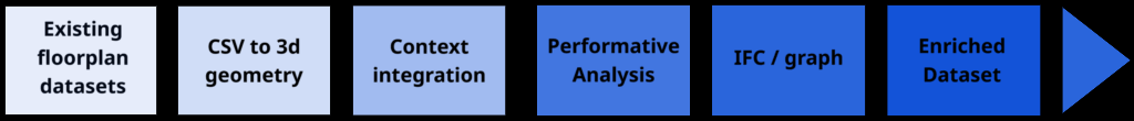 By connecting existing workflows from floorplan to performative analysis, we can create a semi automated pipeline that enhances floorplan datasets with performative data. Our proposed workflow includes acquiring a floorplan dataset, raster-to-vector conversion, generating a 3D model, integrating site context, and running performance analyses.
