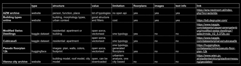 In addition to open datasets, we examined architectural project databases from websites such as ArchiAlly, Archello, Nextroom, and Building Types Online. These platforms maintain structured project data, including floorplans, metadata, and building attributes, but are not open-source and collaboration was not possible. Since our project aimed to produce an open dataset, we excluded these resources.