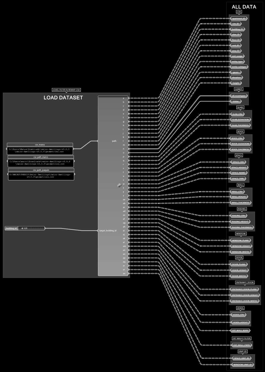 To retrieve and prepare data from the Swiss Dwellings dataset, we developed a custom Grasshopper Python component that reads the CSV files, extracts the required fields, restructures them, and outputs workflow-ready data. This step forms the foundation for all downstream tasks, including IFC authoring and simulation model generation.