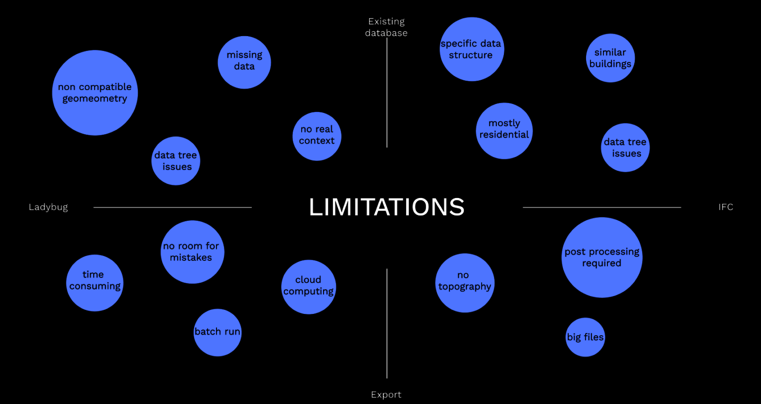 Along the way we hit the real pain points of the field: patchy or missing inputs, the absence of real-world context in source datasets, and the brittleness of Grasshopper data trees when scaling to complex hierarchies. Performance simulations are accurate but computationally heavy, making geometry QA (open loops, overlaps, orphaned elements) and caching indispensable. On the packaging side, IFC files grow quickly and become unwieldy without strict scoping, and the lack of topography further limits contextual fidelity.
