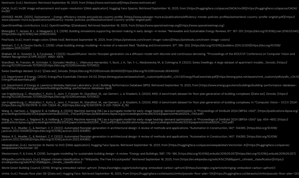 Several tools aim to bridge this gap by integrating intelligent design support into the early phases of architecture. Finch 3D is an example of a commercial platform that applies AI-driven optimization and provides feedback on design decisions, offering real-time support for architects (Finch, n.d.). While such tools highlight the potential of combining generative methods with performance analysis, their methodologies and data foundations are often proprietary and lack transparency, limiting their academic reproducibility (Weber et al., 2022).