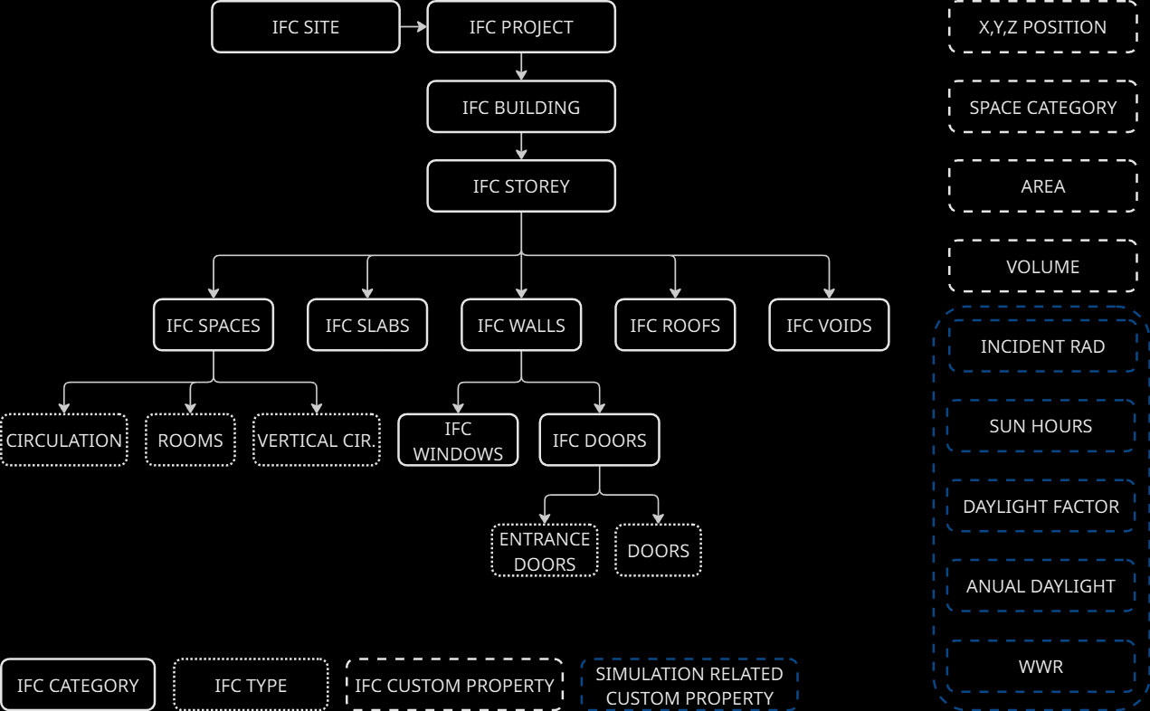 For context integration, we compared open sources and adopted a Cityweft-based workflow to import urban meshes and bind EPW files. Finally, we evaluated simulation platforms and converged on Ladybug Tools for daylight and solar analyses run directly on the GH model (with consistent grids/tolerances), keeping energy modeling as future work. Together, these investigations fixed the project’s fundamentals: the data model (IDs, schemas), the sources of truth (GH for sims; IFC as enriched snapshot), and the export targets (CSV/XLSX, IFC, and graphs).