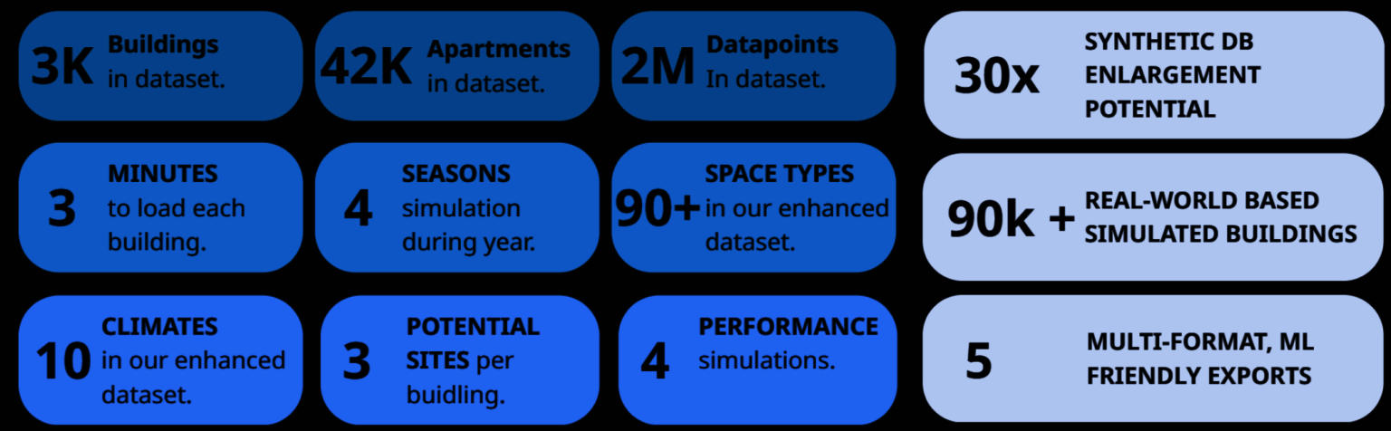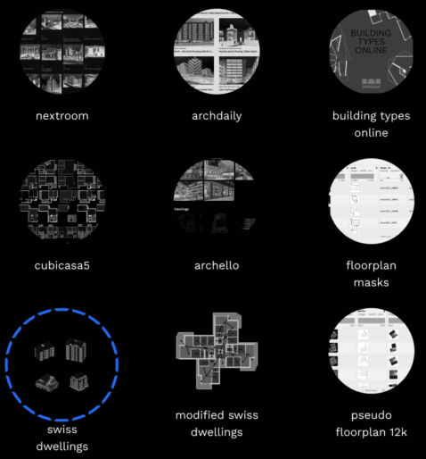 The current dataset forms a strong foundation, but it also highlights the potential for further growth and refinement. The original Swiss Dwellings datset, includes around 3,000 buildings, 42 apartment typologies, more than 2 million datapoints, and over 90 space types.