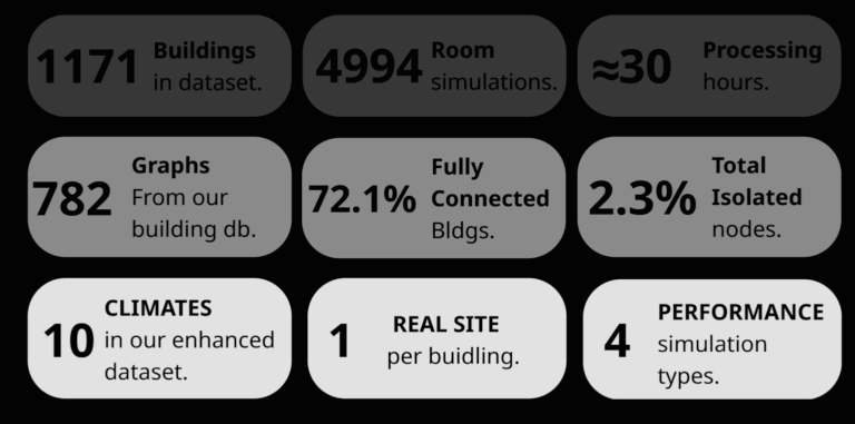 As of this booklet the corpus is partially built and validated. We’ve reconstructed and simulated 1,171 buildings, producing 4,994 room-level simulations across 10 climates, with one real site per building and four performance simulation types. End-to-end processing for the verified subset took about ≈30 hours. From these runs we compiled 782 building graphs; 72.1% are fully connected and only 2.3% of nodes are isolated—useful baselines for connectivity and data quality going forward.