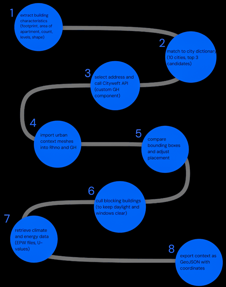Integrating urban context was a crucial step in our workflow, as it enabled us to place buildings within realistic surroundings and run environmental simulations that depend heavily on context. Since the dataset we used did not provide georeferenced locations, we designed a method to systematically assign each building to a suitable city and neighborhood. The process started by analyzing the bounding box and geometric characteristics of each building.