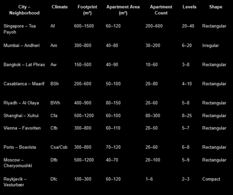 This selection covers a wide range of climate zones, from tropical rainforest and monsoon climates to semi-arid, temperate, continental, and subarctic conditions. For each city, we also defined neighborhood characteristics such as building footprint, apartment area, number of units, building height, and shape, ensuring that the inserted models reflect realistic urban typologies. By situating our buildings in these diverse climates, we can analyze how environmental variables—like solar radiation, daylight, and seasonal temperature variations—affect design outcomes, enabling our dataset to capture a broad spectrum of real-world performance contexts.