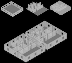 Once the SVG files were prepared, they were imported into Rhino and referenced in Grasshopper. We developed a workflow that combined the three SVG types—walls, room types, and doors—while performing data cleaning, line intersection, and alignment operations. This combination formed the basis for generating 3D IFC-ready models.