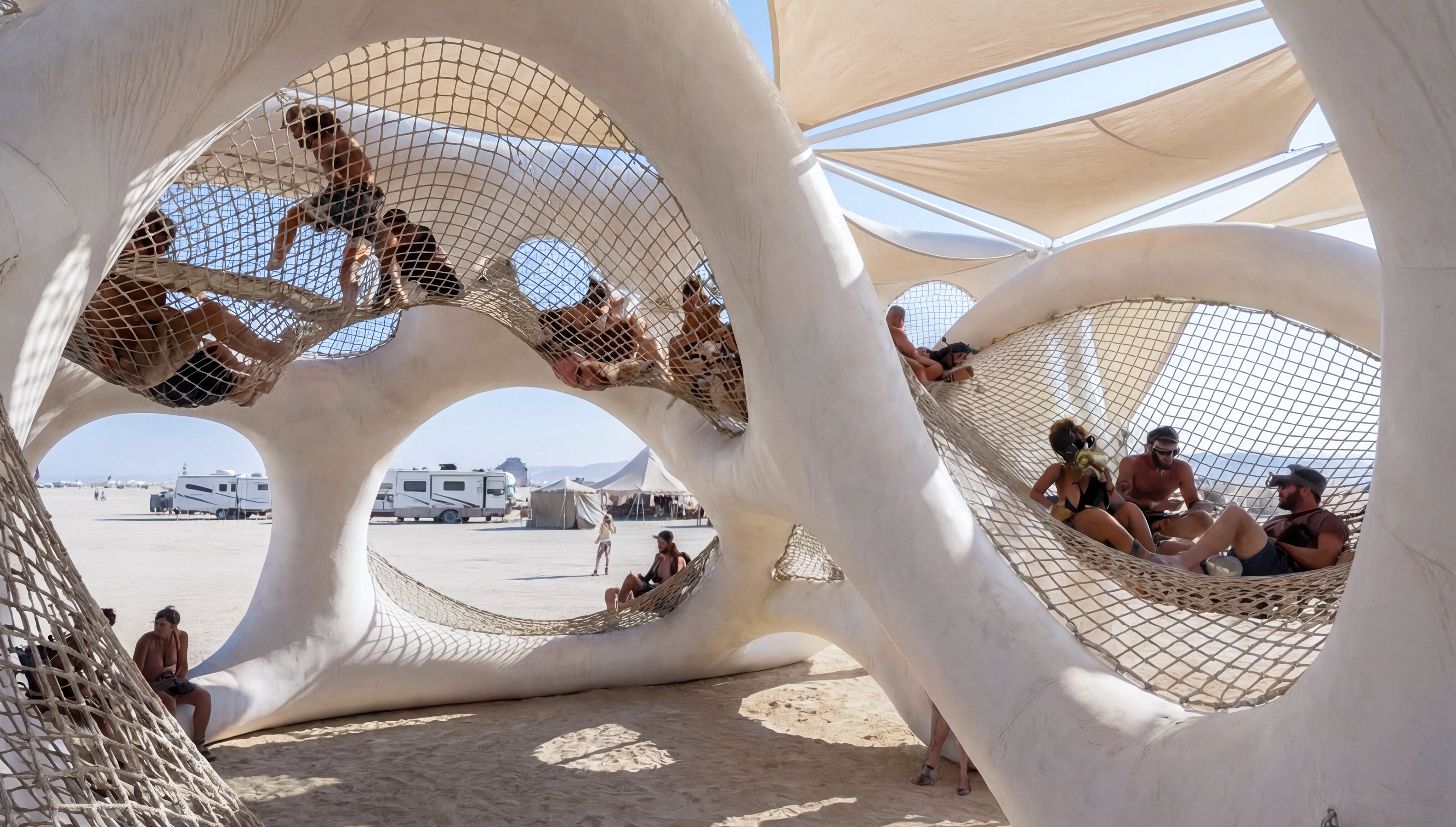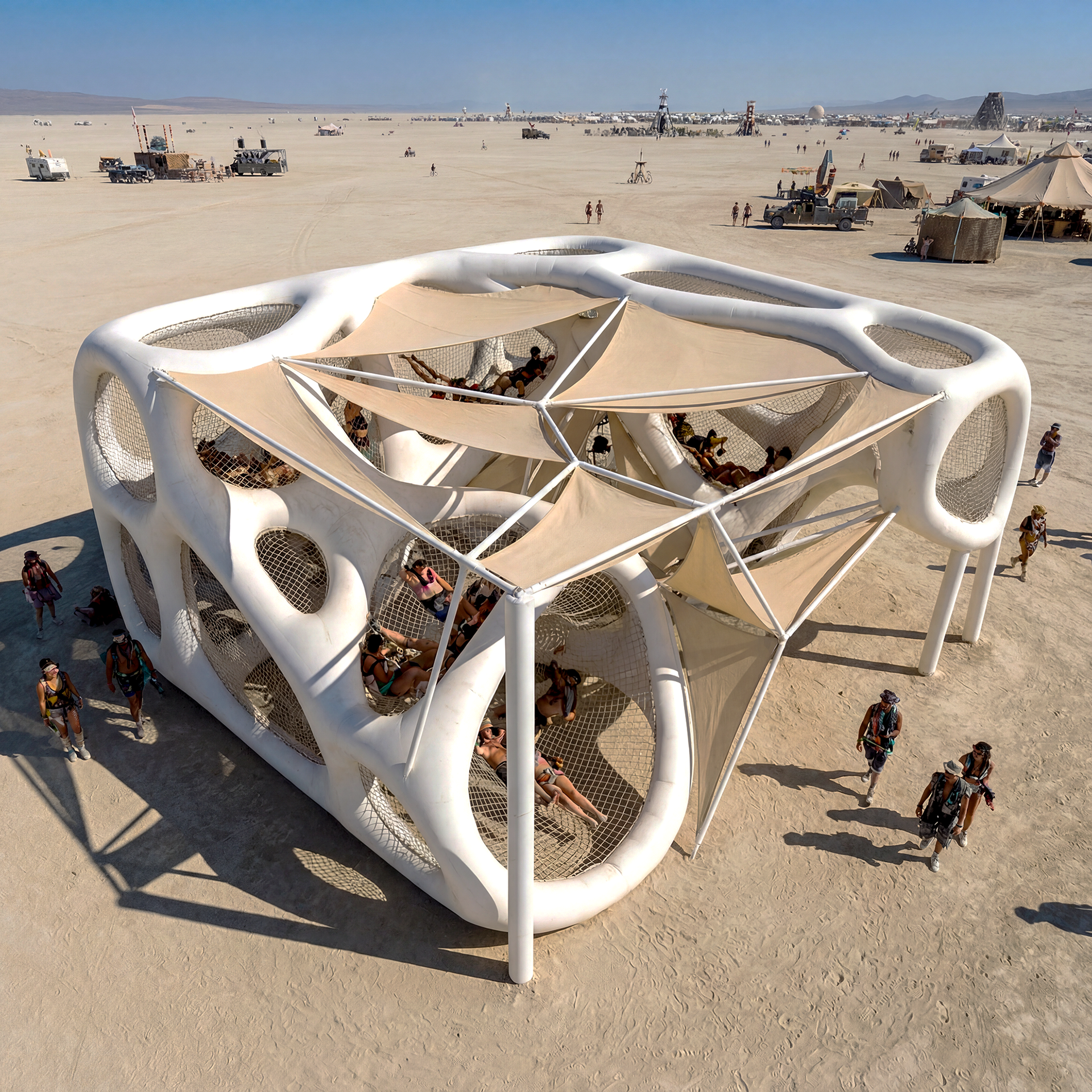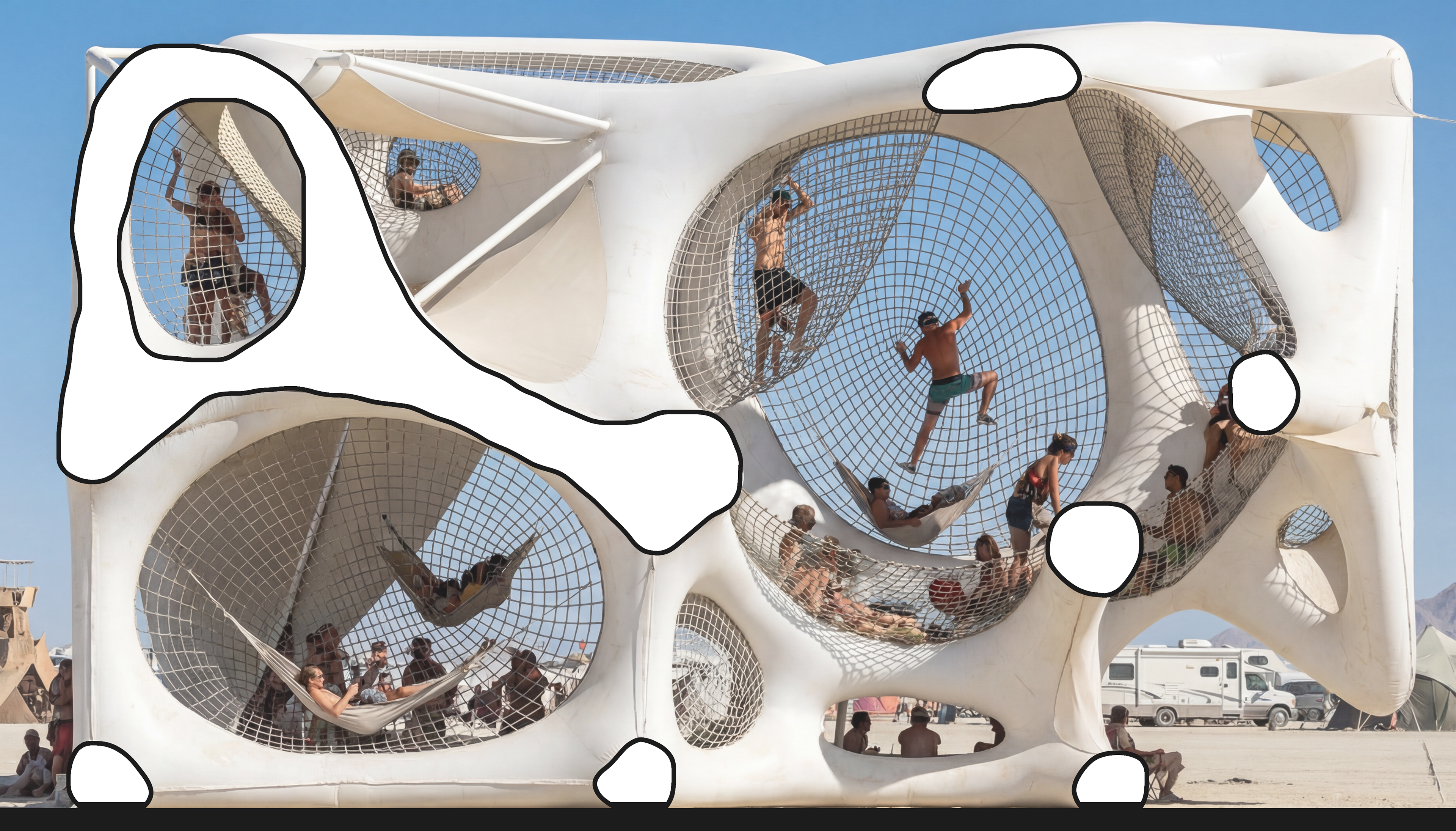 Designed for Burning Man, this project proposes a temporary, climbable playscape that turns movement into a shared experience. A network of tensioned membranes is suspended between an inflatable structure, forming a soft, non-linear terrain with multiple levels for climbing, swinging, lounging, and exploring within a compact 25 × 25 m footprint. The structure encourages spontaneous interaction and ever-changing routes through the structure. Developed as a parametric Grasshopper system, endless variations of the design can be created with variations in height, spans, anchoring, tension and more.